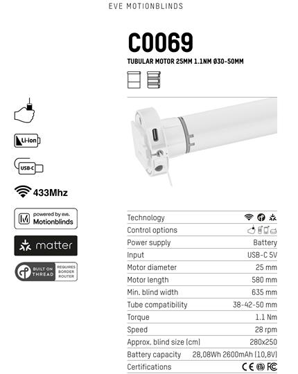 Batterimotor Eve Motionblinds till rullgardiner Art nr C0069 Kampanjerbjudanden! Färg på motorkåpa (vit är standard) Vit motorkåpa (standard) +0 SEK Grå motorkåpa +0 SEK Antracit motorkåpa +0 SEK Välj Ändra Stäng Monteringstillbehör till motor Tillbehörskit och beslag Tillbehörskit till batterimotor stl M +199 SEK Beslagssats vit +80 SEK Beslagssats grå +110 SEK Beslagssats antracit +110 SEK Beslagssats vit, förlängd +110 SEK Välj Ändra Stäng Tillbehör motorer Pull cords, laddkabel, fjärrkontroller m.m. Pull cord till Eve Motionblinds vit, 75cm +55 SEK Pull cord till Eve Motionblinds grå, 75cm +65 SEK Pull cord till Eve Motionblinds antracit, 75cm +65 SEK Laddkabel 3m +99 SEK Fjärrkontroll 1 kanal med väggfäste +285 SEK Fjärrkontroll 5 kanaler med väggfäste +400 SEK Fjärrkontroll 15 kanaler med väggfäste +690 SEK Fjärrkontroll puck 4 kanaler +855 SEK Väggfjärrkontroll 1 kanal +750 SEK Välj Ändra Stäng Fler val Visa extra val Dölj extra val moms ingår med Lägg i varukorgen I lager. Leveranstid 1-2 dagar Beställningsvara. Leveranstid 3-4 veckor Produkten är inte tillgänglig i detta utförande! Batterimotor Eve Motionblinds Produktinformation Batterimotor Eve Motionblinds Produktinformation Till toppen Produktinformation Ny för 2024 är batteridrivna Eve Motionblinds-motorn med Matter och Thread. Det är vår smartaste och enklaste motor att installera och använda. Styr med fjärrkontroll via radio, app/röststyrning via ett Smart hem-system, t ex Apple Home, Google Home, Amazon Alexa eller Samsung SmartThings (kräver en Thread border router) eller manuellt med pull cord. Funkar med både Android och iPhone. Inbyggt Li-ion-batteri som laddas med en USB-C-kabel 1-2 ggr per år. Till motorn ingår en kåpa runt motorn. Vit färg är förvald, men du kan ändra till grå eller antracit. Du kan köpa till en laddkabel och en pull cord i vitt, grått eller antracit. Till din pull cord ingår en kedja i metall. Läs mer i vår Eve Motionblinds-guide här! Mått och vikt:Längd inkl tillbehör: 58 cmDiameter: 25 mmVikt: 600 g Rekommenderas att monteras i våra 38 mm CTR-rör (innerdiameter 36mm). Minsta möjliga tygbredd: 60 cmStörsta möjliga tygbredd: 280 cm Köp kompletta rullgardiner med Eve Motionblinds-motorn här! Tillhörande tillbehörskit: stl M Stl M - i kitet ingår: AxelÄndproppDrivhjulKronhjul Delarna passar i våra 38 mm CTR-rör med en innerdiameter på 36mm. De passar också i andra rör med samma innerdiameter. OBS! Om du ska komplettera en tidigare order med Eve Motionblinds-motorer som du har köpt 2022-2023, tänk på att den nya sortens Eve Motionblinds-rullgardinsmotorer inte fungerar likadant. Den nya motorn har ingen Bluetooth eller Apple HomeKit-teknologi, så du kan inte styra rullgardinen via Bluetooth direkt i Apple Home-appen som tidigare, utan det krävs nu en Thread border router för att styra via Apple Home. Du kan däremot styra både den gamla och nya typen med fjärrkontroll och du kan uppgradera den gamla typen till att fungera likadant som den nya. Klicka på länken för att läsa mer om uppgradering till Matter och vad det innebär: https://motionblinds.com/en/eve/upgrade-to-matter/