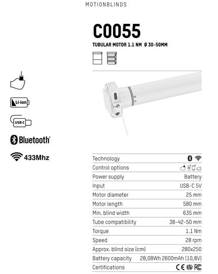 Batterimotor med Bluetooth till rullgardiner Art nr C0055 Kampanjerbjudanden! Färg på motorkåpa (vit är standard) Vit motorkåpa (standard) +0 SEK Grå motorkåpa +0 SEK Antracit motorkåpa +0 SEK Välj Ändra Stäng Monteringstillbehör till motor Tillbehörskit och beslag Tillbehörskit till batterimotor stl M +199 SEK Beslagssats vit +80 SEK Beslagssats grå +110 SEK Beslagssats antracit +110 SEK Beslagssats vit, förlängd +110 SEK Välj Ändra Stäng Tillbehör motorer Pull cords, laddkabel, fjärrkontroller m.m. Pull cord till batterimotor vit, 75cm +55 SEK Pull cord till batterimotor grå, 75cm +65 SEK Pull cord till batterimotor antracit, 75cm +65 SEK Laddkabel 3m +99 SEK Fjärrkontroll 1 kanal med väggfäste +285 SEK Fjärrkontroll 5 kanaler med väggfäste +400 SEK Fjärrkontroll 15 kanaler med väggfäste +690 SEK Fjärrkontroll puck 4 kanaler +855 SEK Väggfjärrkontroll 1 kanal +750 SEK Välj Ändra Stäng Fler val Visa extra val Dölj extra val moms ingår med Lägg i varukorgen I lager. Leveranstid Beställningsvara. Leveranstid Produkten är inte tillgänglig i detta utförande! Batterimotor med Bluetooth Produktinformation Tillbehör Dokument Relaterade produkter Batterimotor med Bluetooth Produktinformation Tillbehör Dokument Relaterade produkter Till toppen Produktinformation Motionblinds-motor för rullgardin från Coulisse. Styr med fjärrkontroll via radio, app via Bluetooth eller manuellt med pull cord. Ställ in timers för automatik. Köp till en Wi-Fi-brygga eller hub för fler funktioner, t ex röststyrning, och koppla ihop med olika plattformar. Funkar med både Android och iPhone. Inbyggt Li-ion-batteri som laddas med en USB-C-kabel 1-2 ggr per år. Mått och vikt: Längd inkl tillbehör: 58 cm Diameter: 25 mm Vikt: 600 g Rekommenderas att monteras i våra 38 mm profilerade rör (innerdiameter 36mm). Minsta möjliga tygbredd: 60 cm Största möjliga tygbredd: 250 cm Köp kompletta rullgardiner med batterimotor Bluetooth här! Tillhörande tillbehörskit: stl M Stl M - i kitet ingår: Axel Ändpropp Drivhjul Kronhjul Delarna passar i våra 38 mm profilerade rör med en innerdiameter på 36mm. Till toppen Tillbehör Produktlista Vår sortering Namn (A-Ö) Namn (Ö-A) Pris (stigande) Pris (fallande) Rensa filter Fjärrkontroll 1 kanal till motorer med radiomottagare 285 SEK Lägg i varukorgen Fjärrkontroll 5 kanaler till motorer med radiomottagare 400 SEK Lägg i varukorgen Pull cord till batterimotor antracit, 75cm 65 SEK Lägg i varukorgen Pull cord till batterimotor vit, 75cm 55 SEK Lägg i varukorgen USB-C-kabel 3 m Vit laddkabel till batterimotorer 99 SEK Lägg i varukorgen Till toppen Dokument motionblinds-manual_user_motion_cmd-03-cm-03-cm-05-cm-45-bluetooth-eng-5576.pdf