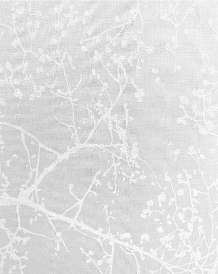 Ett vacker mönster av trädgrenar tryckt på vit polyesterväv. Mönstret syns olika mycket beroende på hur mycket solen skiner. Släpper igenom ljus men skärmar av för insyn och solljus.