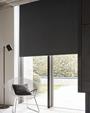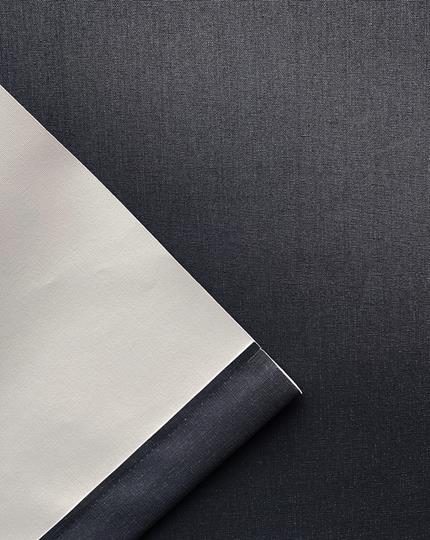 Mörkgrått tyg med en vacker textilstruktur i polyester, med en tunn beläggning av akryl på tygets baksida gör rullgardinen 100% ljustät. Vit på baksidan för bättre ljus- och värmereflektion.