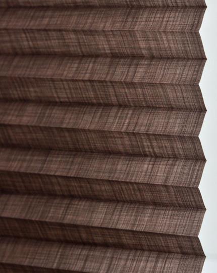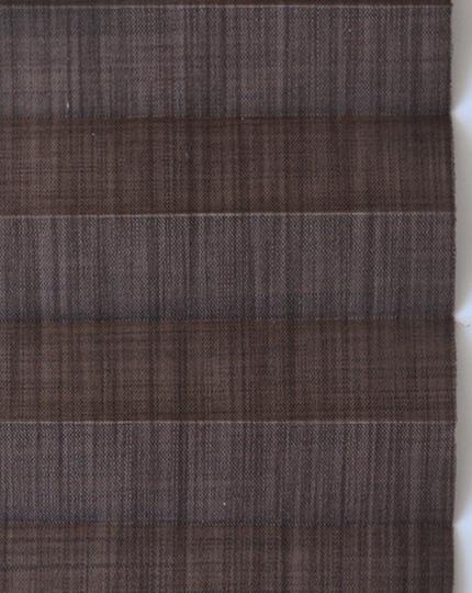 Transparent mörkbrun plisséväv i polyester med lite textur i tyget.