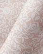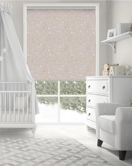 Pastellrosa rullgardin med grafiskt tryck i vitt. Väven är i polyester och har en tunn beläggning av akryl på tygets baksida vilken gör rullgardinen 100% ljustät. Baksidan är vit för bästa reflektion av värme.
