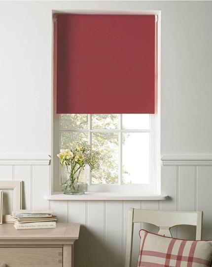 Det här är vårt mörkläggande standardtyg. Ett rött, slätt tyg i polyester med en tunn beläggning av akryl på tygets baksida som gör rullgardinen 100% ljustät. Rött på både fram- och baksida.